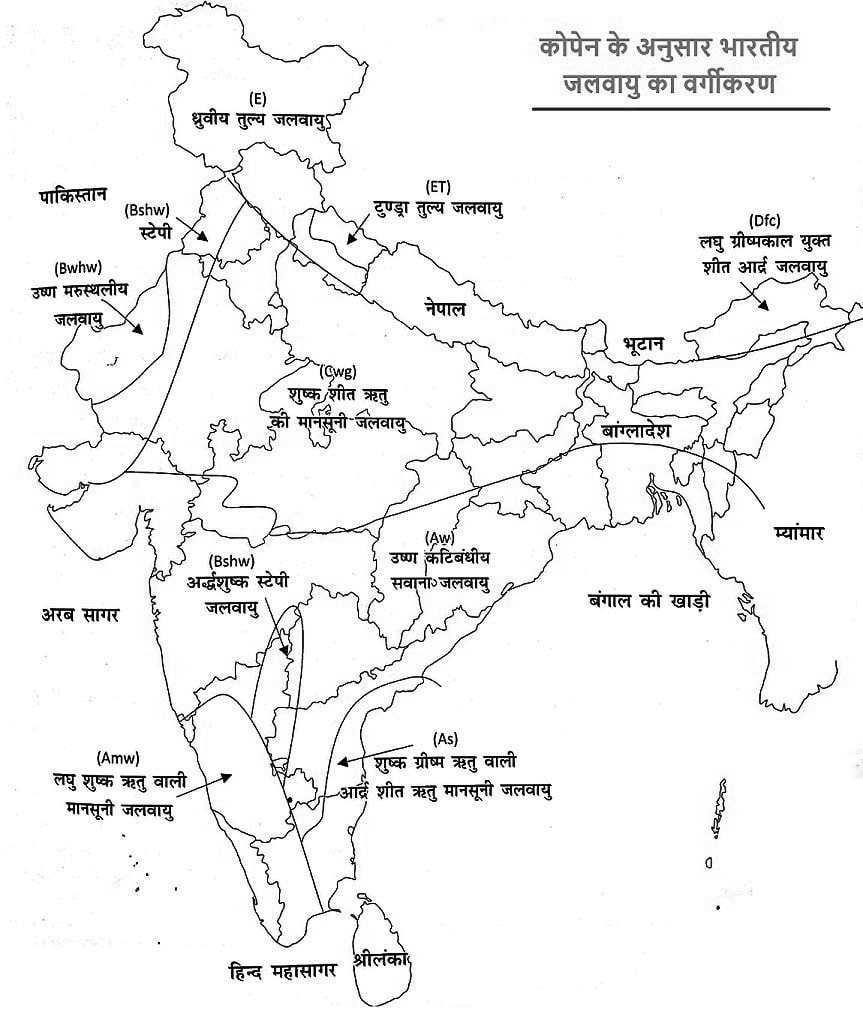 कोपेन द्वारा भारत की जलवायु को निम्न वर्गों में विभाजित किया गया है, जो निम्न है —