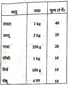 सुपर बाजार में सब्जियों की मूल्य सूची निम्नलिखित है: