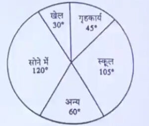 निम्नलिखित पाई-चार्ट एक विद्यार्थी की प्रतिदिन क्रियाओं में व्यतीत समय के घंटो को (डिग्री में) दर्शाता है। वह सोने की तुलना में खेलने में कितना समय ( में) बिताता है।
