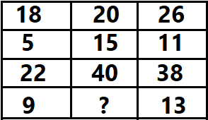 निम्नलिखित प्रश्न में अंकों का एक आव्यूह (मैट्रिक्स) दिया गया है। ये एक निश्चित प्रवृत्ति का अनुसरण करते हैं जो पंक्तिवार या स्तम्भवार हो सकते है । अतः लुप्त अंक का चयन कीजिए।